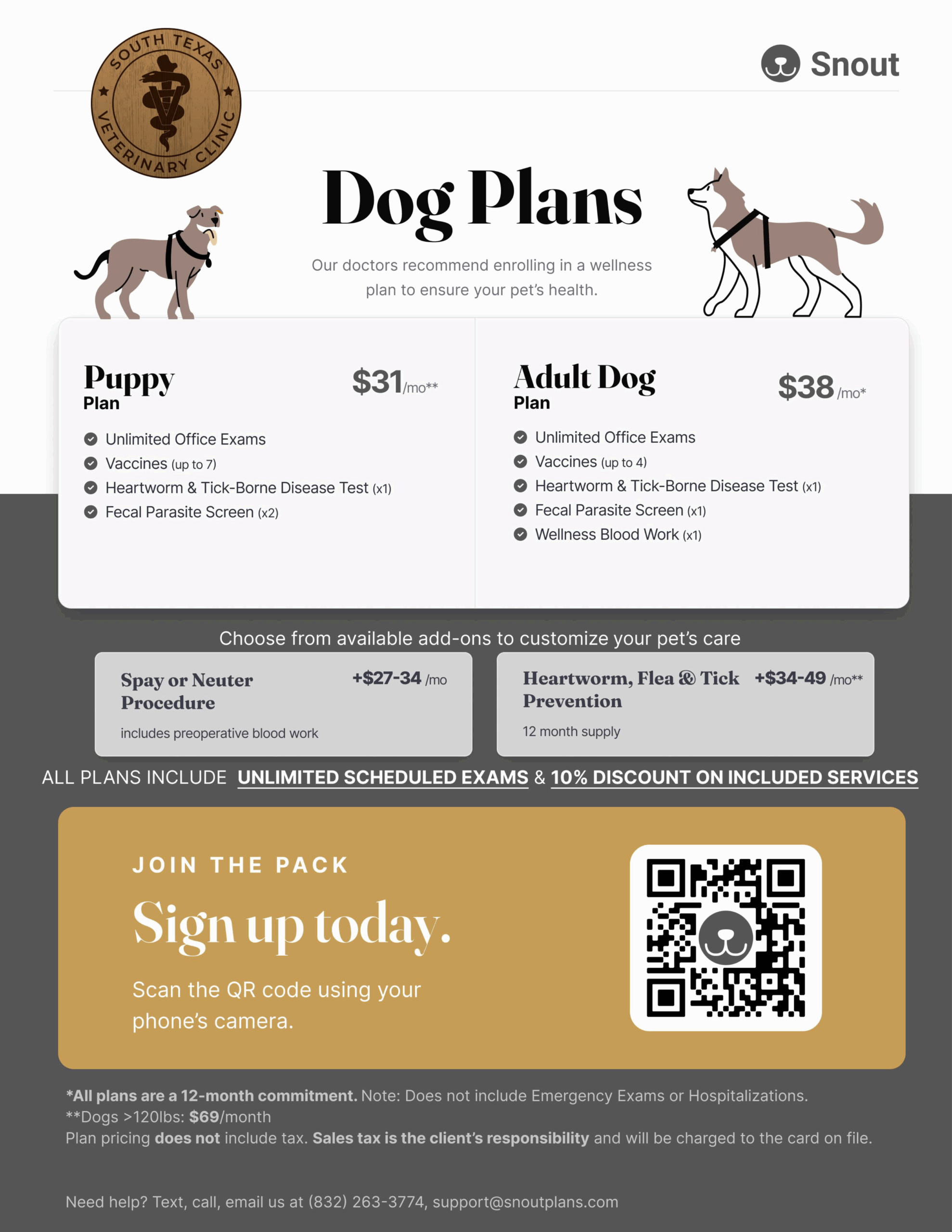 Enrolling in a Snout Wellness Plan is easy. You can sign up from the comfort of your home or ask one of our front desk team members to assist with your enrollment.